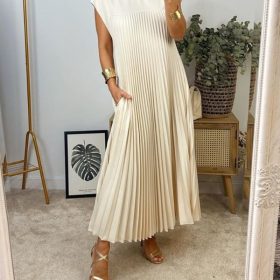 Basic short-sleeved, simple solid color, two handy pockets, trendy and elegant. Add style and comfort to your wardrobe with the Cap Sleeve Pleated Flowy Maxi Dress. Combining style and function, this dress strikes the perfect balance between casual luxury and everyday comfort!