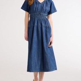 Made from lightweight cotton denim, this easy-to-wear dress features convenient pockets, a flattering tiered hem and ruched detailing to help you slip into the modern romantic trend with ease – think sophisticated, girly vibes of ’90s silhouettes.