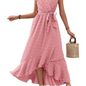 The Sleeveless Sundress Features Wrap V Neck Design And Ruffle Cap Sleeve, Make You Eye-catching And Attractive. The Self Tie Belt Will Shrink At The Waist And Creates an A-Line Silhouette. The Maxi Dresses With Wrap Ruffle Hem Flows Naturally And Perfectly Shows Your Personality!